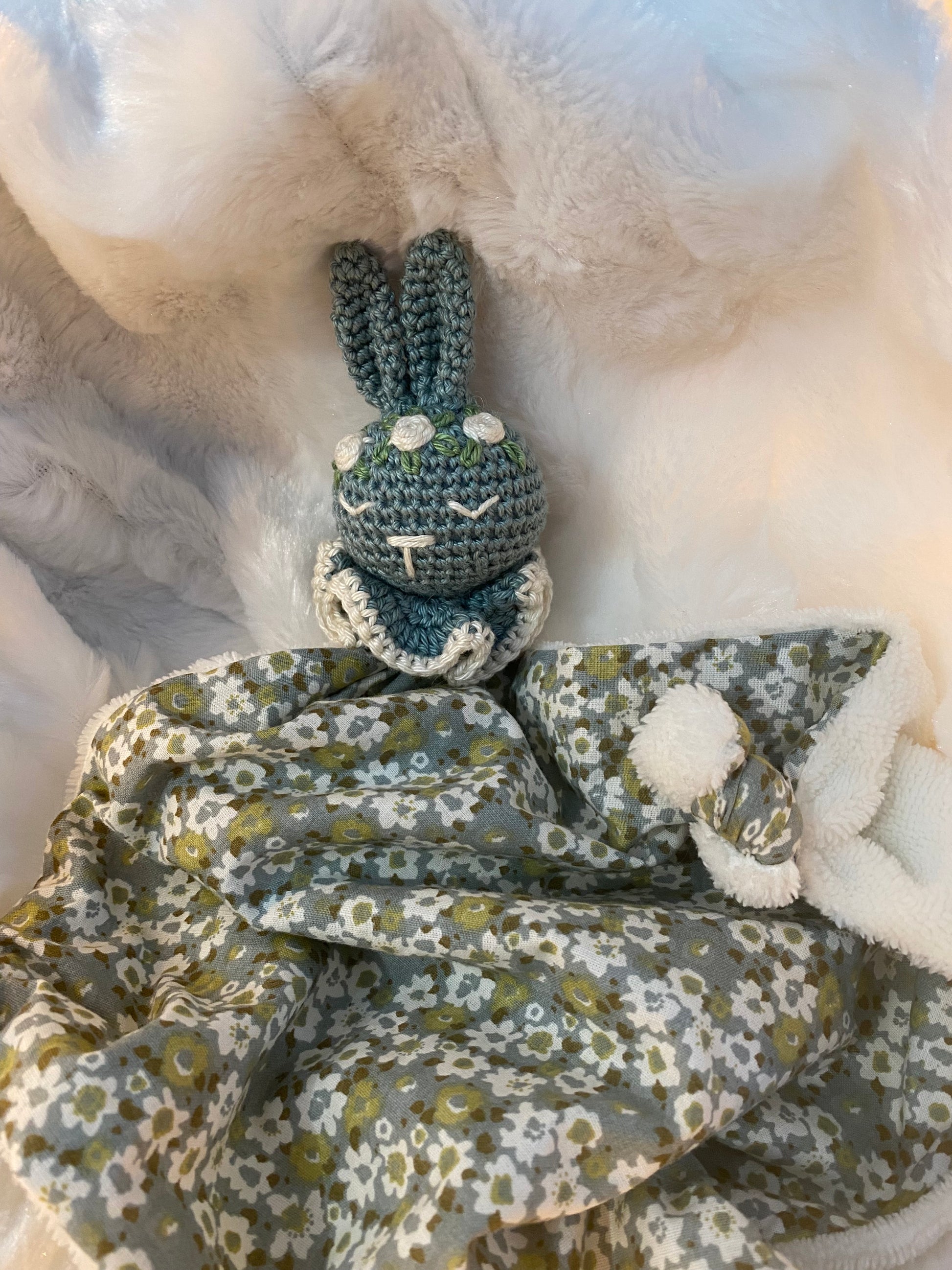 Doudou Lapin en forme de lange au crochet réalisé à la main avec amour dans mon atelier des Hauts de France (Valenciennes), spécialement conçu pour apporter confort et réconfort à votre petit trésor. Ce petit Lapin est parfait pour devenir le compagnon idéal de votre bébé tout au long de la journée,de la nuit, lors des sorties,des chagrins,à la crèche, chez nounou,chez papi mamie.