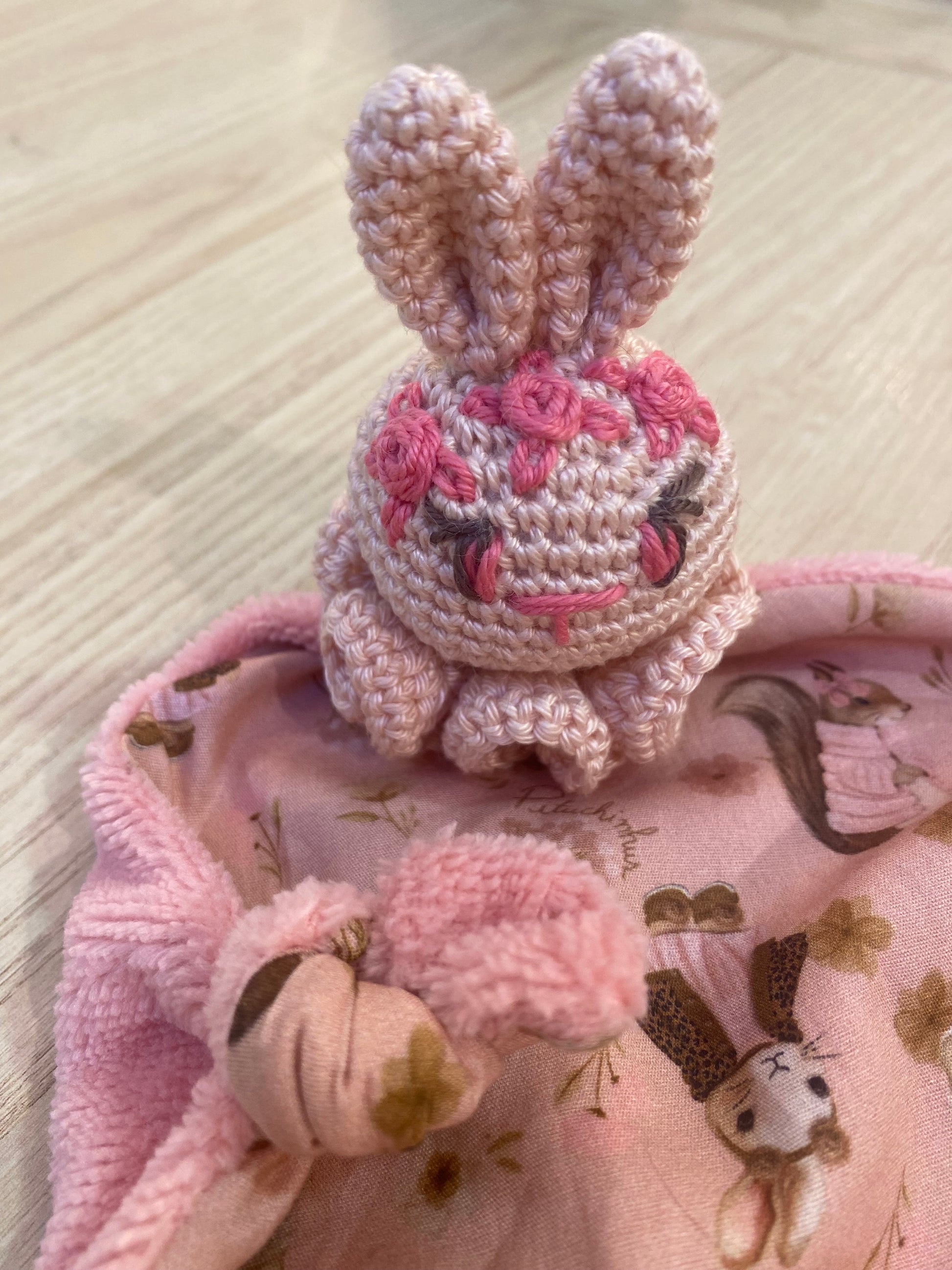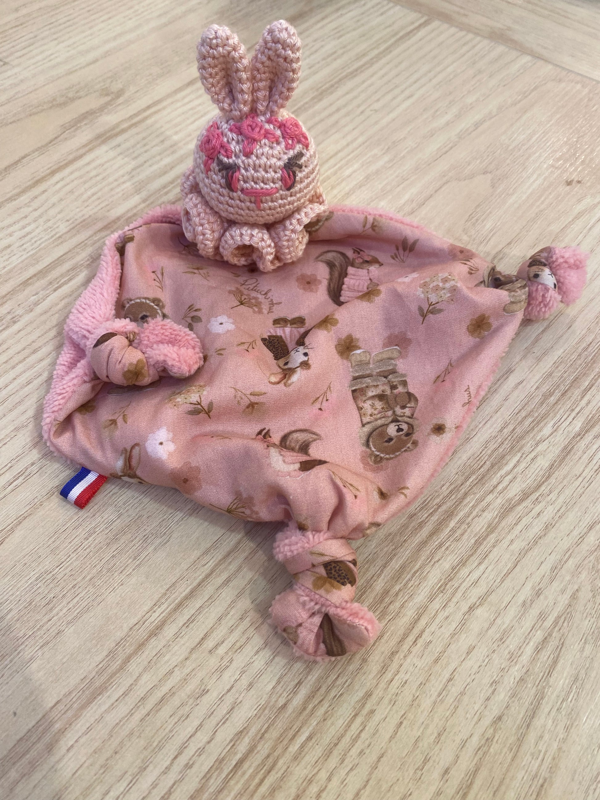 Doudou Lapin en forme de lange au crochet réalisé à la main avec amour dans mon atelier des Hauts de France (Valenciennes), spécialement conçu pour apporter confort et réconfort à votre petit trésor. Cette petite Lapin est parfaite pour devenir la compagne idéale de votre bébé tout au long de la journée, de la nuit, lors des sorties des chagrins, à la crèche, chez nounou, papi ou mamie.
